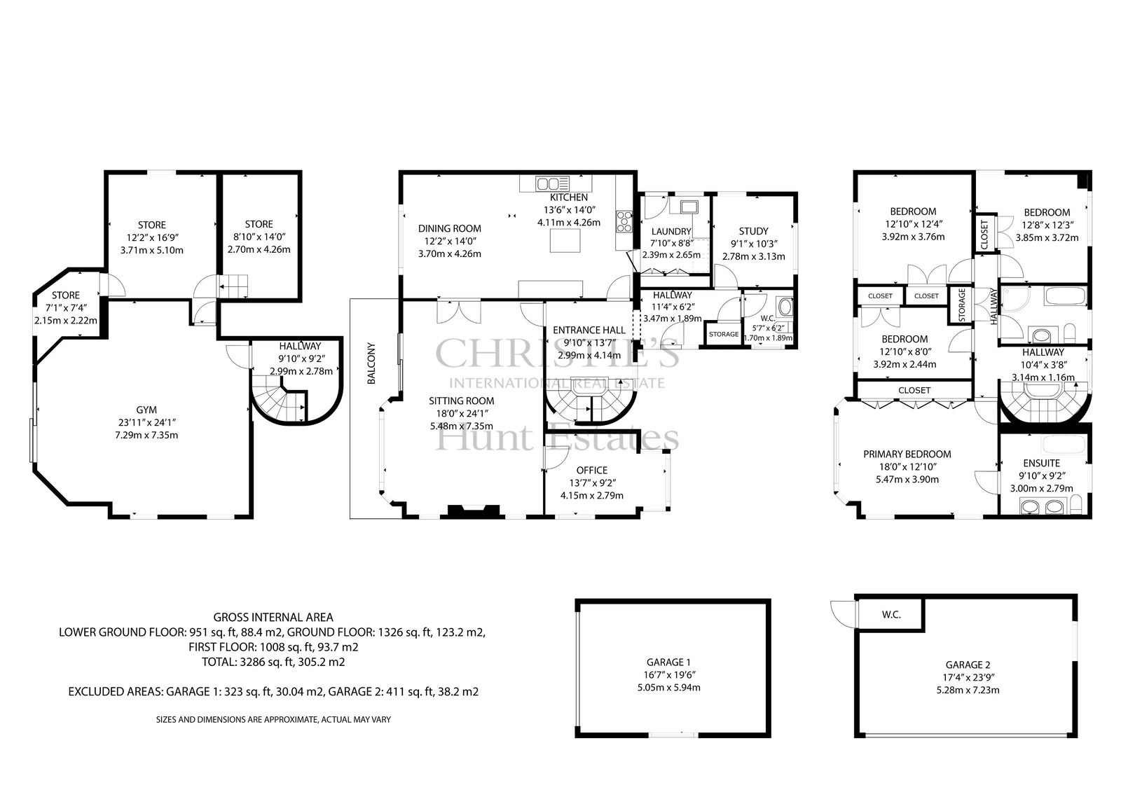 The ground floor accommodation comprises an elegant hallway with a fine hardwood staircase, a large kitchen/diner with superb, elevated views, a well-proportioned sitting room with rural views and that opens to a balcony, two private offices, a utility room and cloakroom. On the lower ground floor there is a large room (c. 570 sq ft) currently used as a gym and which has fully glazed sliding doors ensuring the rural views can be enjoyed to the full, the doors opening to a large terrace. Adjacent rooms are being used as excellent storage, but the entire lower ground floor would lend itself to the creation of an integral multi generation unit (subject to any necessary permissions).