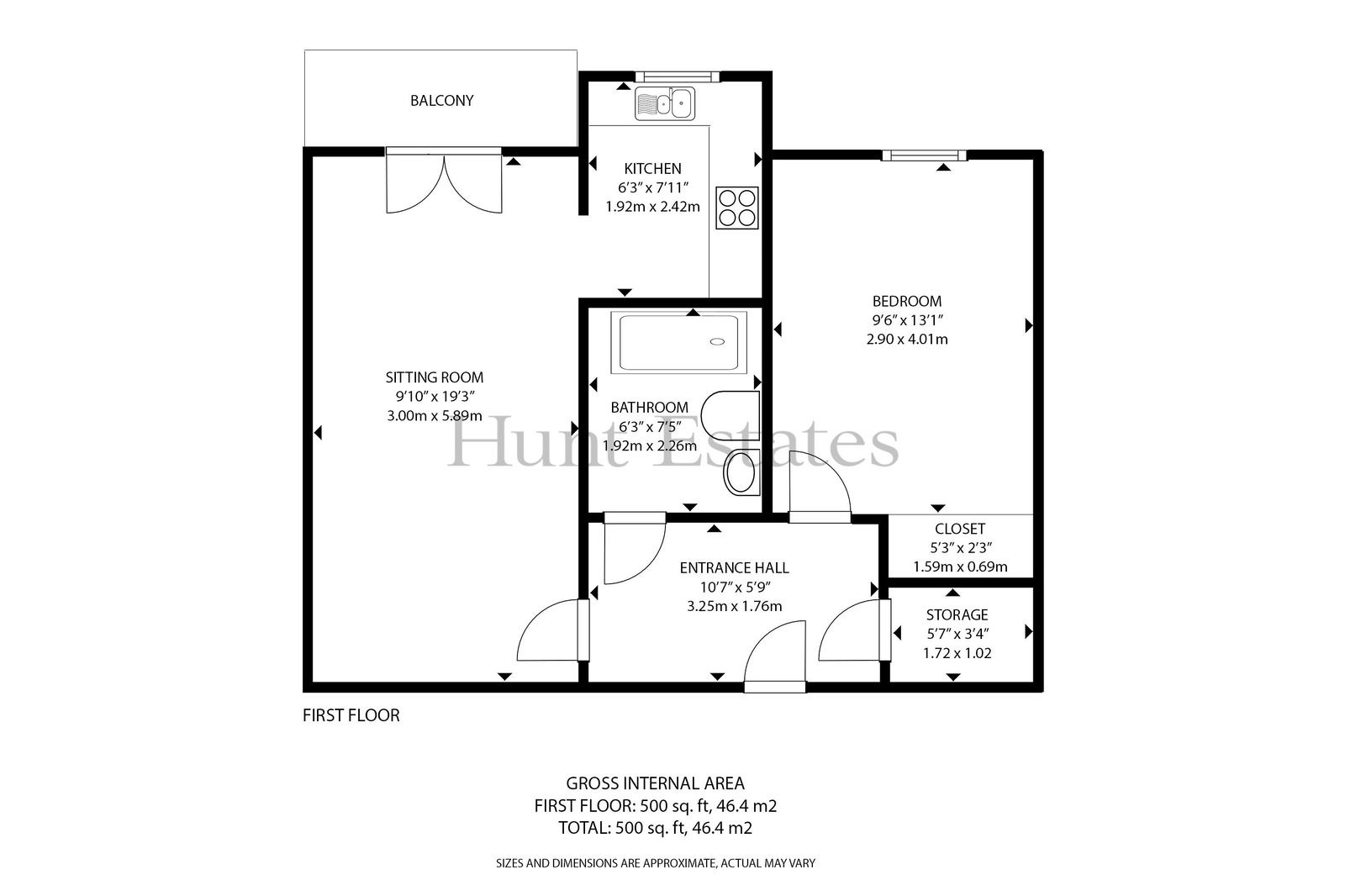 The apartment comprises: entrance hall, airing cupboard, sitting room with access to the balcony, archway to kitchen with some appliances, double bedroom with built in wardrobe, bathroom with a bath and shower over.